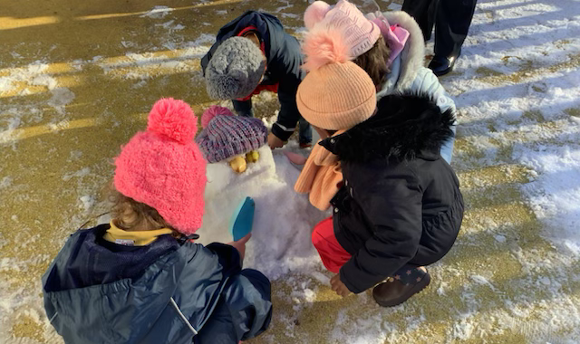 We used our whole bodies to see what happened when we walked on it, touched it and built with it. It felt cold and we left footprints and patterns in the snow. We tried sledging and built a snowman too.