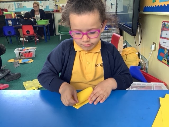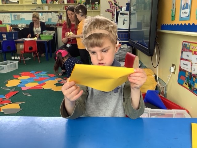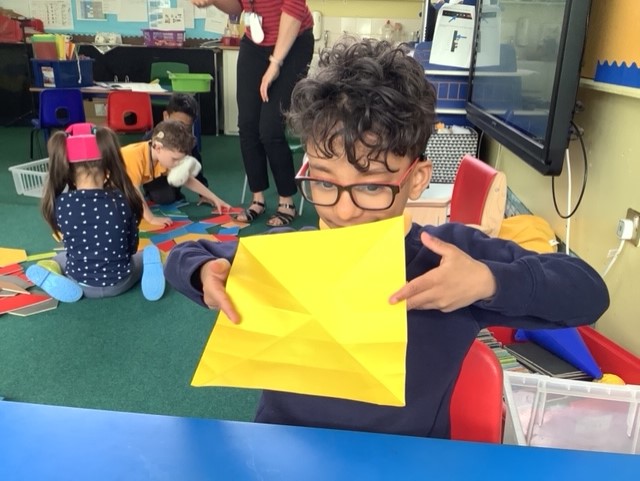 We loved the challenge of turning a square into a triangle but we couldn’t use scissors. We had to focus and keep trying and then discovered we could make triangles, rectangles and a smaller square.