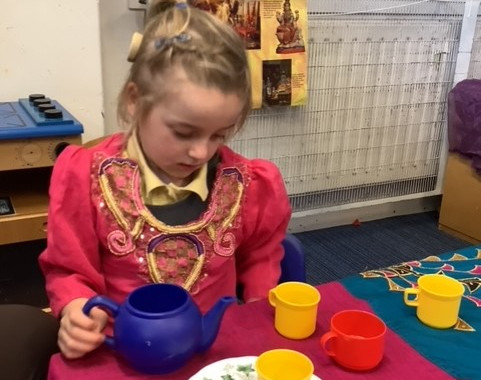 We have a Diwali home corner and made plates of special food that is eaten at Diwali. We enjoyed dressing up in traditional clothes too. We made Mehndi hand patterns on the computer. Mrs Ahmed taught us how to make chapatis. We all made our own chapati and then watched how they were cooked. They were delicious!